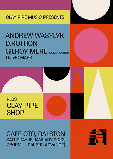 A3 Poster and 1 badge for Clay Pipe Night at Cafe Oto on 15th Jan 2022.